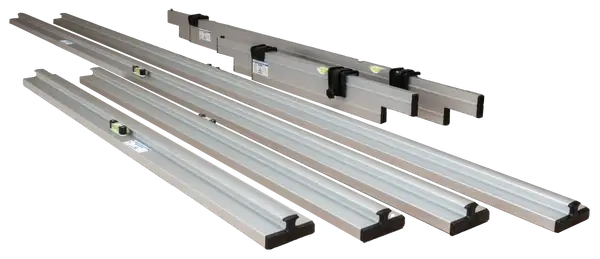 La barre de nivellement réglable peut être facilement ajustée à la largeur de travail souhaitée. Les rails profilés emboîtables sont solidement fixés à l’aide d’éléments de serrage stables. Les rails de base offrent une base solide avec leur large surface d’appui de 100 mm et disposent de poignées encastrées ergonomiques qui facilitent une installation précise.