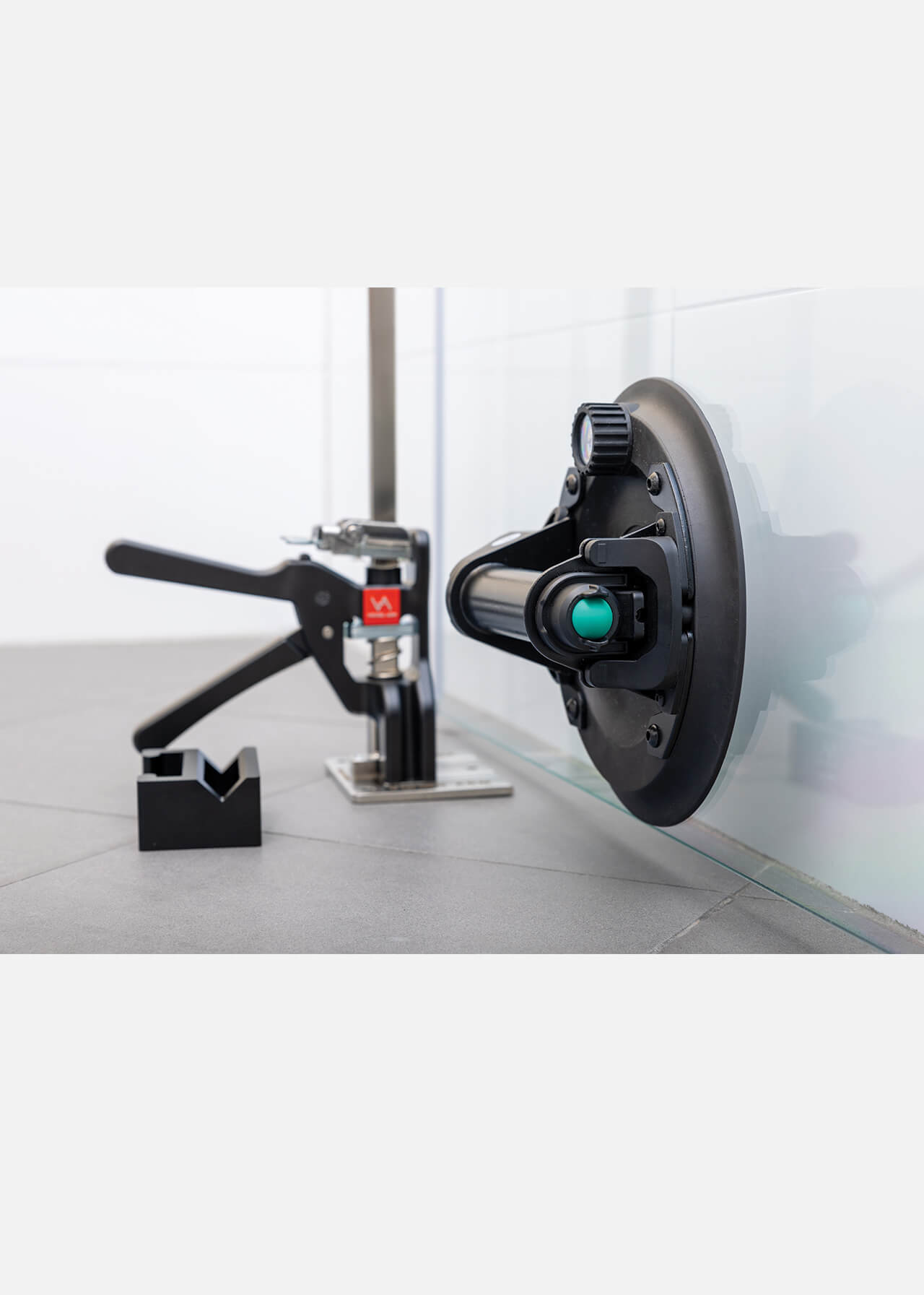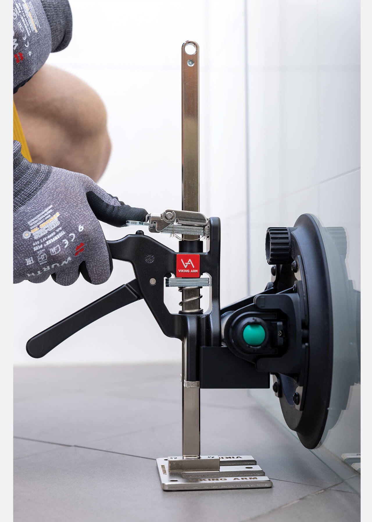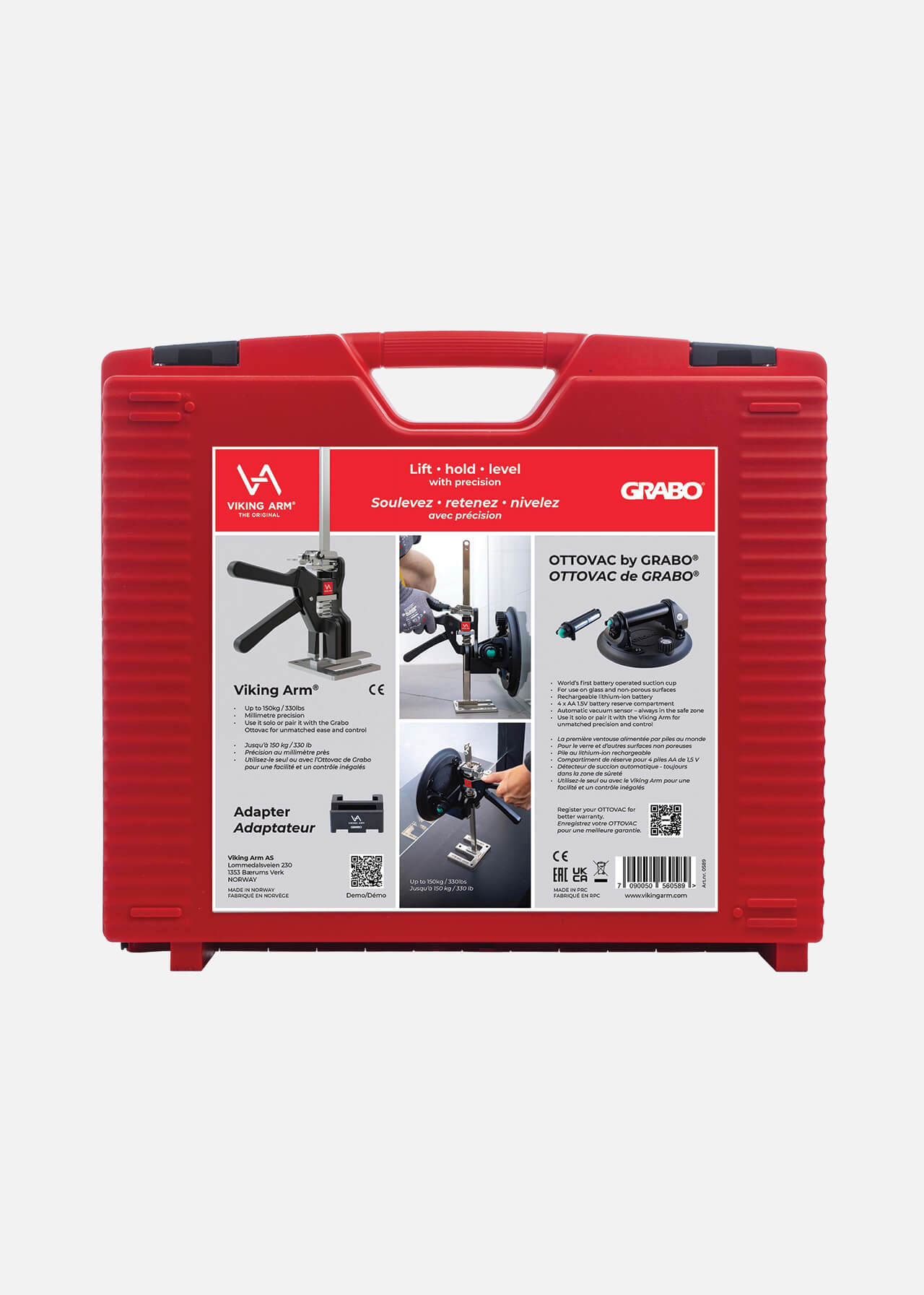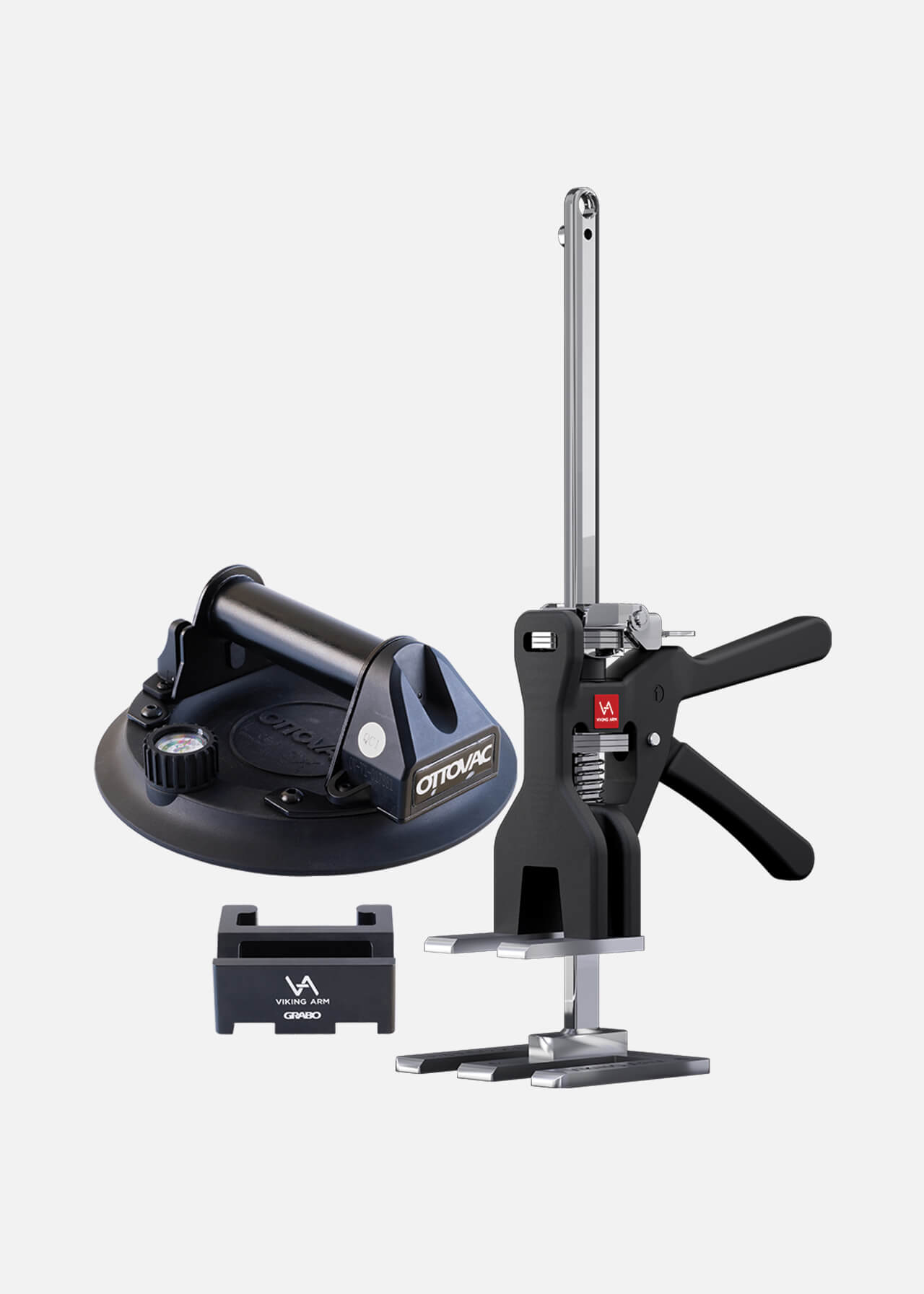 The ultimate glazing set for professionals, bringing together premium tools from the two of the decade’s most innovative brands: the Viking Arm® and Grabo®. Each tool is indispensable on its own, but together they revolutionize the way you work. Both the Viking Arm and the battery-operated Ottovac suction cup can lift up to 150 kilogram. Use the Ottovac to easily lift and move heavy glass or flat, non-porous objects, e.g. metal doors, to the installation area. Then, place the Viking Arm with its cradle (adapter) under the Ottovac’s handle for lifting, holding and making precise millimeter adjustments. You don’t even need the initial 6 mm gap under the object for the feet of your Viking Arm. No need for extra helpers— you and the set do it all. The Ottovac suction cup includes a rechargeable lithium-ion battery and a reserve compartment for 4 x AA 1.5V batteries. A sensor monitors the vacuum and activates the pump if suction drops below -55 kPa, ensuring safe, reliable operation.